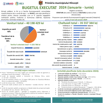 Stimaţi hînceșteni! Vă prezentăm executarea bugetului municipal Hînceşti pentru semestrul I al anului 2024. Infograficul a fost elaborat cu suportul Programului “Comunitatea Mea”, care este publicat şi pe pagina Web oficială a primăriei https://primariahincesti.md/. Mulțumim partenerilor Programului “Comunitatea Mea”, USAID Moldova, IREX în Moldova, pentru suportul acordat!